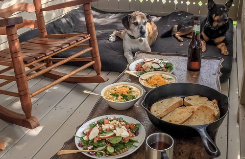 We love dogs! There are multiple dog beds for your beloved pooch to snooze and hang out with the gang. Move the dog beds around the house to make sure they're always a part of the fun. In addition to dog beds we also provide an assortment of dog bowls, toys, waste scoops and bags, and a kennel. Note that dogs are not allowed upstairs where the bedrooms are located though you are welcome to sleep on the sofa bed if they feel more comfortable with a human nearby.