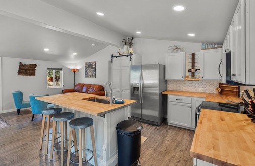 This open, bright, completely updated home has Joanna Gaines-inspired decor, new furnishings, and three bedrooms for a terrific family stay. Vaulted ceilings, light from a bank of windows, ample seating and a TV make the living room a great place to gather; a sofa sleeper lets you invite an extra guest or two; a second sitting area is perfect for quiet conversation. A fully equipped kitchen has stainless steel appliances and all you'll need for eating in; it's matched with an elevated dining room for six and three seats at the breakfast bar. A queen bedroom suite, a full bedroom and a bunk room round out the sleeping accommodations.