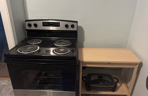 You enter through the back door to a shared back door area. Walk up the steps and the entrance to the apartment will be at the top. There will be a door code given to you the day of your arrival. You enter into the kitchen which has a full equipped kitchen with pots and pans, silverware, stove and fridge, and a Keurig. Then you enter the living room area and the bathroom is off of this room. And then the bedroom is in the back with a large wall in closet. The bedroom has a desk if you are traveling and need a place to work on a computer.