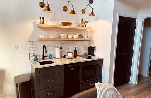 This modern cottage located on 6 sprawling acres is one of six located on Bluff Mountain across from the Trillium Wedding Venue. Nestled in the woods each cottage has a kitchenette, dining table with seating for four, love seat and two chairs. The large sliding glass doors at the front allow guests to immerse themselves in the relaxing woodland setting. The master bedroom features a king sized bed. Extra sleeping space is provided by two queen sized beds in the loft. The loft has a view through the large windows at the front of the cottage. A large shower and double sink vanity round out the amenities of the cottage. Our outdoor space features a deck with two adirondack chairs to enjoy your morning coffee while watching the beautiful morning sunrise. In the evening, you can enjoy our common area fire pit with a glass of wine while watching the lights of the city below.