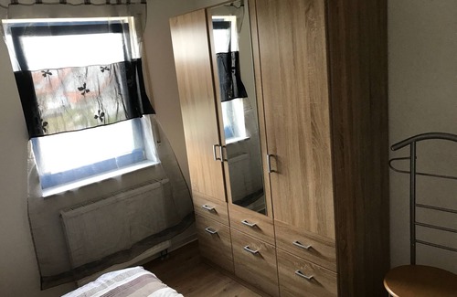 Bedroom 2: wardrobe, box spring bed 100 cm x 200 cm, with bedding suitable for allergy sufferers. The filling material of the quilted bed (climate fiber) does not provide a breeding ground for dust mites, spores and fungi. Therefore, this bed is ideal for everyone who suffers from house dust allergy. Baby cot also possible.