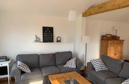 Idyllically located on the Baltic Sea, with private lawn on the beach and terrace with sea views - the apartment Baltic Sea view in the country house Habernis offers up to 4 people much holiday comfort in a modern country house style. Ground floor: - large living / dining area with fireplace - well equipped kitchen - modern shower room - bedroom with large French bed (DB 160x200) - bedroom with bunk beds Outside: - terrace with sea view, garden furniture and parasol - large garden with barbecue - private lawn with Terrace and barbecue on the Baltic Sea beach washing machine and dryer are available for common use. Wi-Fi and parking spaces are available. Wi-Fi and parking spaces are available.