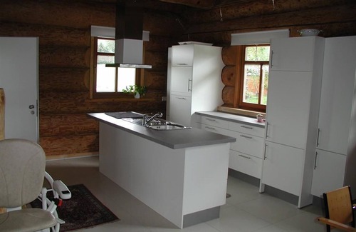 The apartment is located at the foot of the Erbeskopf, directly at the National Park Hunsrück-Hochwald, between Idar-Oberstein and Trier, in a Canadian round-trunk wooden house. The apartment can be used for 2 to a maximum of 4 persons. The ground floor has a separate entrance, hallway, kitchen with dining area, guest toilet and a partially covered terrace in the entrance area. Upstairs are a spacious living room with sofa bed, a barrier-free bathroom with shower and toilet, a bedroom with a covered balcony. The staircase upstairs is equipped with a stairlifter. The wonderful landscape, the special flair of the wooden house and the lovely furniture invites you to relax. The naturopathic practice in the house offers you the opportunity to arrange therapy and wellness treatment appointments.