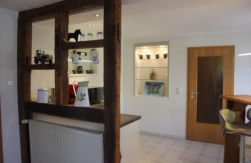 In our exclusive apartment on our former farm in the beautiful Hofschaft Edelkirchen we have retained the flair of the old farmhouse and connected with the modern. The cozy large living room with an idyllic view, dining area and two sofa beds invites you to relaxing evenings. In our modern, fully equipped kitchen, with old wooden framework, you can let your creativity run wild. The bedroom is modern and equipped with a double bed. The second room has two single beds, which can be connected to a double bed if required and a small secretary. The bathroom with walk-in shower is functional and yet stylish! The covered terrace is available in all weather. In addition, there is a terrace with another 18m ² available. You can use the approx. 1. 700 m² large garden according to your needs. Pitches are available free of charge. Hiking trails are right outside the door. There are several dams in the area. Further leisure activities, which are located directly in Halver: Hiking, climbing park, Waldfreibad, miniature golf course, Sterngolfplatz, riding stable, swimming hall, fitness trail, Schleifkottendraisinenbahn, diving schools, Geocaching, with enough snow: cross-country ski, sledge meadow, ski lift. What does Halver have to offer in terms of gastronomy? From the cult pub with excellent steaks and castles, a western restaurant, Italian, tea lounge, cake studio, tea time cottage, ice cream parlors, breakfast parlors, more restaurants with home-style cuisine, various pubs, bakeries offering breakfast to various fast food shops, which also provide delivery service, everything is there. Diverse shopping possibilities are reachable within 7 minutes by car.