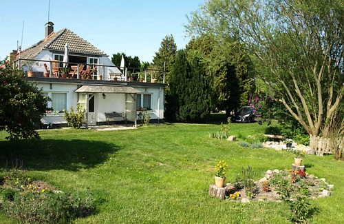 On a bike ride in one of the most beautiful landscapes in Germany, we have discovered a gem: A very individual villa near the Fleesensee. The lower part of the house, we have as a holiday gestaltet- for nature lovers, cyclists, hikers, families with children ... For rarely traveled road towards the house is protected by a park-like garden with willow trees and conifers and two goldfish ponds. Behind the house opens from the BBQ terrace on 1000 m² garden lawn an unobstructed panoramic views of the natural landscape of the Mecklenburg Lake District and fabulous sunsets. The apartment offers 100 square meters space for 4 people. The leisure facilities are very lush: table tennis, badminton, boule, board games, library and more than 50 films on DVD's.