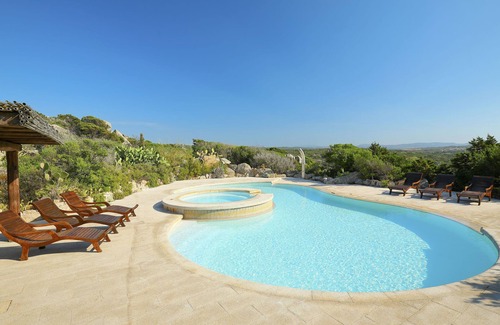 Beautiful villa "Bianca", detached. Property composed of main house and outbuilding, in the district of Terravecchia 2 km from the centre of Santa Teresa, 24.5 km from the centre of Palau, 61 km from the centre of Olbia, in a sunny, elevated position on top of a hill, 1.5 km from the sea, in the countryside. Private: large terraced garden, 5'000 m2 (not fenced) with wildlife garden and trees, swimming pool kidney shaped (10 x 4 m, depth 130 - 200 cm, seasonal availability: 01.Apr. - 31.Oct.). Outdoor shower, hot tub, pergola, terrace, garden furniture, barbecue. In the house: WiFi, washing machine. 40 m long bumpy motor access to the house (via unmade road). Stepped path to the house. Parking on the premises. Supermarket 2 km, restaurant 1.5 km, bus stop 2 km, ferry "Olbia" 68 km, sandy beach "Rena Bianca" 4 km, swimming bay 1.5 km. Marina 1.5 km. Please note: car recommended.