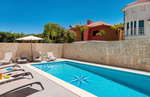 Large, cosy terraced house "Villa Curie Sonnenland". In the centre of Sonnenland, in a quiet, sunny position. Private: property (fenced), swimming pool angular (8 x 3 m, depth 140 - 140 cm, seasonal availability: 01.Jan. - 31.Dec.). Barbecue. In the house: air conditioning. Parking on the premises, public parking on the road. Bus stop "Los Robles Verdes" 290 m. The owner does not accept any youth groups. Neighbourhood highly sensitive to noise. Quietness and good behaviour expected.