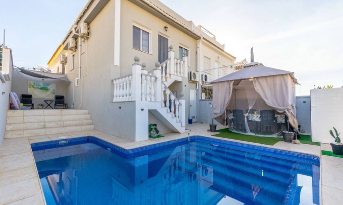 Terraced house "Hamber". In the district of Camposol, in a quiet, sunny position, 10 km from the sea. Private: swimming pool (4 x 4 m, depth 150 cm, seasonal availability: 01.Jun. - 30.Sep.). Outdoor shower, terrace, garden furniture. Supermarket 3.5 km, restaurant 4 km, bar 4 km, café 4 km, bus stop "Paretón" 9 km. Golf course (18 hole) 2 km.