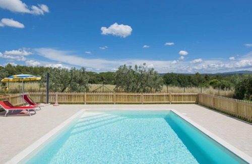 Very beautiful house "Melograno", built in 2020. 8.5 km from the centre of Riparbella, 4 km from the centre of San Pietro in Palazzi, 5 km from the centre of Cecina, in a sunny, elevated position, 8.5 km from the sea, in the countryside. Private: property 4'000 m2 (fenced), garden wildlife garden and trees, meadow, swimming pool fenced (8 x 5 m, depth 150 cm, seasonal availability: 27.Mar. - 06.Nov.). Outdoor shower, patio, terrace (15 m2), garden furniture, barbecue, children's playground. 100 m long motor access (via unmade road). Parking (for 2 cars) on the premises. Supermarket 1.4 km, shopping centre 1.4 km, restaurant 2 km, railway station "San Pietro in Palazzi" 5.5 km, sandy beach "Cecina Mare, Bagno Gabbiano" 8.5 km pebble beach "Le Gorette" 7 km, indoor swimming pool 8.5 km, thermal baths "Calidario" 38 km. Nearby attractions: Pisa 52 km, Lucca 80 km, Firenze 112 km. EXTRA: A sun bed, a deck chair and an umbrella at the Bagno Gabbiano bathing establishment in Marina di Cecina, 8.5 km away, reserved for customers and included in the price.