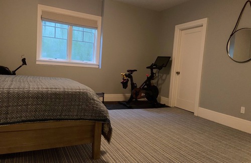 The 6th bedroom is in the basement bedroom with has a window, a peloton bike, and an adjoining bathroom.