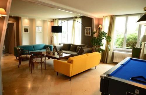 Providing a garden, Vaste Maison de 300 m2 en forme de bateau pour 15 L'Iliade provides accommodations in Port-en-Bessin-Huppain. This vacation home features free private parking and a shared kitchen. Outdoor seating is also available at the vacation home. Featuring a terrace and garden views, the spacious vacation home includes 5 bedrooms, 3 living rooms, flat-screen TV, an equipped kitchen, and 4 bathrooms with an a bath or shower. Towels and bed linen are available in the vacation home. There's also a seating area and a fireplace. There is an on-site bar. You can play billiards at Vaste Maison de 300 m2 en forme de bateau pour 15 L'Iliade. Guests can also relax in the shared lounge area. Crique Vauban is a 12-minute walk from the accommodation, while German Battery of D-Day is 4 miles from the property. Caen–Carpiquet Airport is 22 miles away.