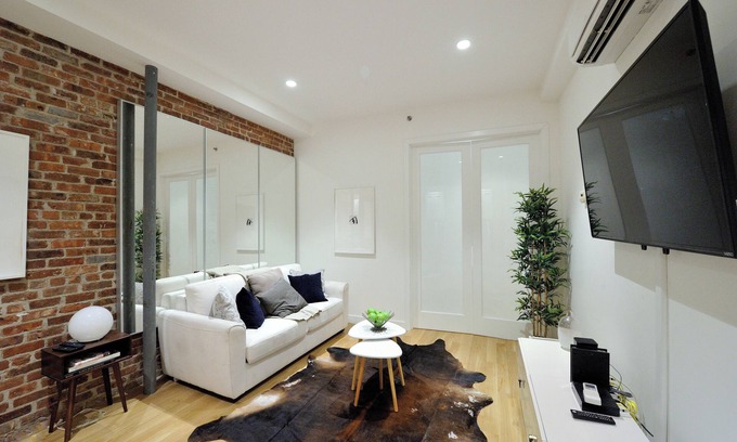 Step inside and be greeted by a bright, airy space featuring high ceilings, exposed brick walls, and gleaming wood floors that add a touch of warmth to the contemporary décor. The living area is outfitted with sleek, modern furniture, creating a stylish yet comfortable setting for relaxation or socializing. Whether you’re unwinding after a day of sightseeing or hosting friends for a night in, this space has everything you need, including WiFi, a flat-screen TV, and air conditioning.