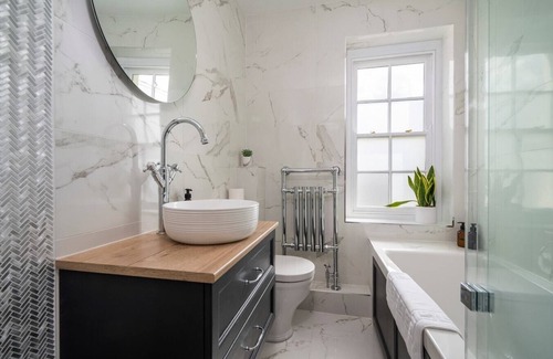 The sitting room contains parquet wood effect flooring and plush sofa and chairs as well as a wall-mounted smart TV. An exposed brick chimney breast contains a wood-burning stove to allow guests to enjoy a cosy evening watching a film with the fire roaring. Upstairs, two king-size double bedrooms are each served by their own en-suite (one with a bath with shower over, the other with a shower) and they have been finished with high-end marble effect tiles and rainfall-style shower heads.