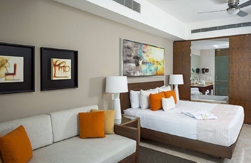 The Grand Mayan Master Suite: The Two Bedroom Suite features two bedrooms with two king-size beds, two bathrooms, and a living room with dining table and kitchen. This space also features a terrace with private plunge pool and three TVs.