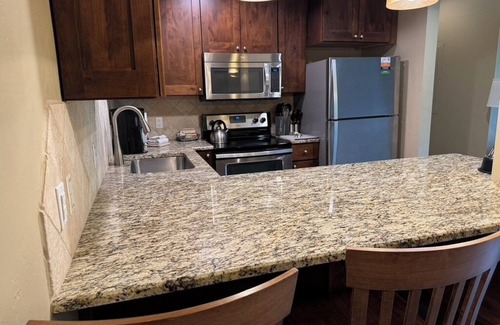 My condo location offers views of the major Breckenridge high peaks, as well as minutes access to the Independence Chair lift. Included at no additional cost are the many Grand Lodge amenities and amazing services. First photo is YOUR VIEW, from our condo. This is a luxury condo, fully furnished, sleeps up to 4 ppl, with granite and stainless steel kitchen, fully stocked for serving of 6-8 people. Gas fireplace provides ambiance and heat. The amenities available (at no charge) are indoor heated garage parking, gym with cardio and weight equip, 4 outdoor hot tubs, Grotto pool, YOUR OWN personal big theatre, YOUR OWN ski locker (steps from the Independence Chair) and bowling. Bell service and Concierge is available to assist with making plans. High Speed WiFi. Complimentary shuttle service from Grand Lodge to the town, any time of day and night, with return to Grand Lodge ... again at no additional cost. The Breckenridge Gondola is also available to transport you to town and back, as another option. If your reservation is less than a full week, a cleaning fee of $199 (not including tax) is charged by Grand Lodge, for payment, upon checkout.