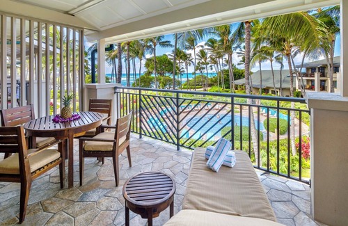 You have dramatic ocean views and can keep your doors and windows open all night, with privacy in this third-floor Ocean Villa at Turtle Bay! This penthouse villa is just steps from the sandy beach with beautiful ocean and pool views from the lanai, living room and master bedroom by elevator or staircase. It has a serene lanai where you can see the ocean and all the tiki torches lighting the grounds at night! There are just 40 yards of lawn before the sandy beach, and the pool and BBQs are just down the stairs about 20 yards from the villa!