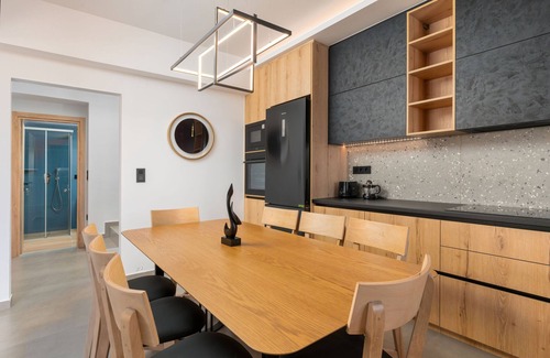 Expansive outdoor spaces include the heated pool and a composure area of sunbeds and umbrellas. The villa's list of amenities includes also a BBQ installation and a seating and dinning table for entairtaining and recreative gatherings with family and friends.