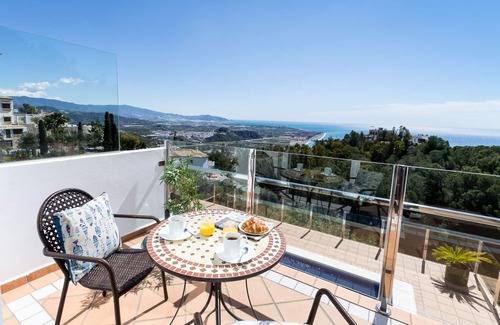 The Villa's name reflects the lovely views it offers over a verdant wooded valley to the sea and the picturesque white village of Salobreña with its Moorish castle (lit up at night).