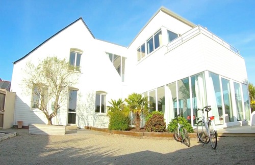 Suspended over the sea, the Villa du Port welcomes you in a grandiose setting, with a breathtaking view of the open sea, the beach of Dossen, the island of Sièck and the small port of Moguériec. Classified 5 stars, this architect villa gives the unique sensation of sailing on a luxury liner, while offering the comfort and space of an upscale house. Here, you live to the rhythm of the tides, between changing light, sparkling sea and absolute calm.