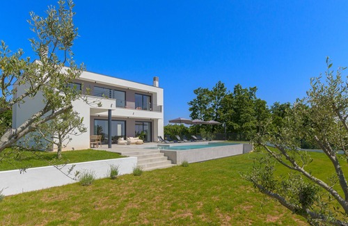 Located in the small Istrian village of Bibići, villa Felice has everything you need for your perfect vacation - a large private infinity pool with salt water (41 m2) where you will spend sunny summer days, an outdoor kitchen with a barbecue and enough space for 6 deckchairs while you enjoy the sun or with a good book.The interior of this modernly decorated Villa offers you a warm atmosphere so that you feel at home during your stay. Inside the villa there is a large living room and fully equipped kitchen with dining room, 2 spacious bedrooms and 2.5 bathrooms. Also, the bedrooms have access to the balcony (21 m2). The gallery offers a view of the infinity pool and the Mediterranean garden (1100 m2) with several olive trees.The villa is air-conditioned, has WiFi, private parking and offers everything for a nice vacation.Rovinj, Pula, Poreč, Rabac, the most famous cities in Istria, are 25 minutes away by car. Likewise, almost all beaches in Istria are 20-30 minutes away by car.Svetvinčenat, a small historical place, is only 1.5 km away. The area is ideal for mountain biking and a good starting point for discovering the whole of Istria. Distances: post office 2500m, restaurant 2500m, shop 2500m, center 2500m, sea 18000m, beach 18000m, airport 26000m.