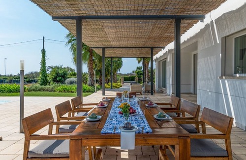 Villa I Chiani is a modern villa, immersed in the countryside near Gagliano del Capo, a few minutes from the beaches of Santa Maria di Leuca and Marina di Pescoluse. Built in the 80s and now completely energy efficient, the villa combines traditional materials with a modern and minimalist design. Arranged entirely on one level, it houses four bedrooms and three bathrooms, a living area with dining room and kitchen that opens onto a shaded veranda. The garden, surrounded by palm trees and Mediterranean vegetation, is equipped for outdoor living, with a barbecue area, wood oven, swimming pool and petanque court. Located in the lower Salento, the villa is perfectly positioned for exploring both the Adriatic and Ionian coasts.