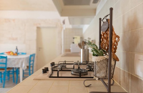 Recently restored and dating back to 1930, Le Nacchere is located in the picturesque Itria Valley near Cisternino. The charming towns of Fasano, Locorotondo, Martina Franca and Alberobello are just a few minutes away. Le Nacchere offers a perfect blend of historic charm and modern amenities, making it an ideal retreat in the beautiful Itria Valley. With four bedrooms and three bathrooms, the villa can comfortably accommodate up to eight guests. Each room is equipped with air conditioning, ensuring a pleasant stay in any season. Outside there is a lovely garden area with a dining table in the shade of a large pine tree. The barbecue in the garden invites you to enjoy a barbeque. The rectangular infinity saltwater pool measures 4.5 x 11 meters and has a shoreline suitable for children (2 x 3 meters). It is fully equipped with outdoor showers made of local stone. About 100 meters from the property, a public cycle path surrounded by nature runs through the entire Itria Valley and connects Alberobello to Ceglie. Bicycles are provided. Upon arrival, guests will find a welcome pack with typical Puglia products.