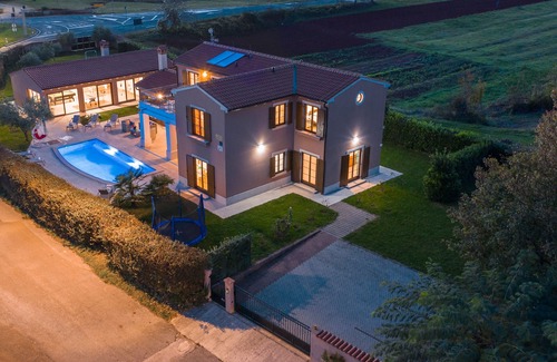 In a small place in the southern pa.crt of peninsula Istria you will find a beautiful 5-star villa Kanco (400 m2) with amazing mountain view and picturesque green environment. Villa was designed by art, verdy talented designer awarded two times in a row by distinguished Lon3don prize. Villa consist of four bedrooms, each in other color, and every room has its lounge and her own bathroom. There are also two separat6.hed bathrooms, a big kitchen and living room with a cozy couch. charming fireplace and special entertainment for children – playstation 4 . Living and all bedrooms have LED television and all areas have air condition. Vila is sf54rj.fuitable for 10 persons. Vila has also a relaxing room with jacuzzi and sauna. Villa is surrounded with 1000 m2 of green lawn, 50 m2 swimming pool (with massage function) and its stone beach with covered terrace and a big wooden table. In the nearby, you will find another smaller building (100 m2) – game room with table tennis, table football, billiard, Picado and also an inner grill. On the outside there is also an exterior grill. In the backyard there is entertainment for children ; swing, toboggan, trampoline, all surrounded with olives, flowers and green fence. The villa has tree parking places. Villa Kanco is located in the place Frkeči close to the small town Barban. Nearby beaches are located in places called Krnica, Rabac, Rakalj approximately 15 km from the villa, and 40 km from beautiful famous tocuristic pearls such as Rovinj, Poreč, Vrsar, Rabac. Villa is suitable for renting in winter time because it has heating all over the house.