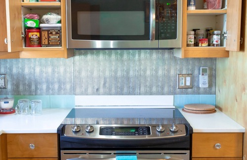 EAT-IN GOURMET KITCHEN is fully equipped with high-end stainless steel appliances, many small appliances, central island, Staron countertops, solid maple cabinets filled with more supplies than comparable rentals and a washer/dryer combo with ironing board, iron and detergent.