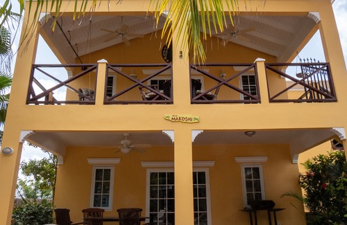 Welcome to our luxurious vacation home! The Villa Makoshi Penthouse features 1350 Sq. ft. of Caribbean décor with vaulted ceilings, 2 bedrooms, 2.5 bathrooms, 2 open air decks, private wireless internet, washing machine, fully equipped kitchen, outside gear rinse station with shower, gear drying rods and a charcoal barbecue. For your added comfort, we offer air-conditioning throughout the entire villa; the living room, kitchen and bedrooms; something not all villas can offer. All of the windows and exterior doors in our apartment have mosquito screens so that you can open the windows and doors to enjoy the lovely trade winds. For security, we offer 2 document wall safes and 1- 17' laptop safe, 2 secured decks, window and door security bars. A serene atmosphere for hanging out and enjoying the peace and quiet of your private second floor balcony with outdoor ceilings fans to keep the mosquito's away. Watch all the activity from above and admire a bird’s eye view of Kralendijk, the open country side and the hills of Bonaire. Good chance you will even spot a donkey or two. Your Caribbean dream awaits you!