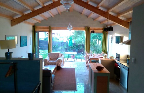 Marulha-Guincho is located within a 12,000 m2 landscaped property with a rural horizon of local vegetation and pine trees. In its own garden has a table and chairs and a parking space. The living room, dining room and open kitchen occupy a single large space (50m2) overlooking the garden. The bedroom area with a large queen size bed is separated from the rest of the house by 2 steps, leading to a higher level with access to a private solarium with sun loungers and shower. A stone floor covers the entire area of the house.