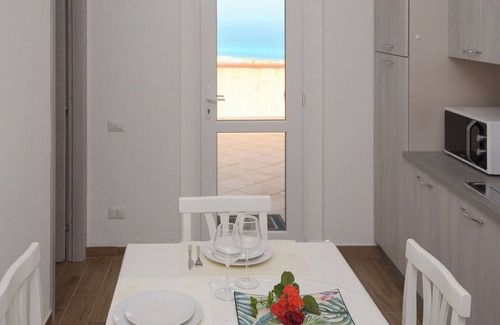 The interiors of Villa Paola are characterised by a few essential furnishing elements that create a pleasant and welcoming environment. A fascinating mix of contemporary elements and references to tradition defines the interior design. The living area includes a functional and fully equipped kitchenette, an LED TV and an air conditioning system. The sleeping area consists of a spacious bedroom, a bathroom with shower and bidet, and a bedroom with a bunk bed. From the balcony, illuminated by natural light, you can enjoy meals and aperitifs outdoors while enjoying an incredible view of the sea. Ample parking is available for guests.