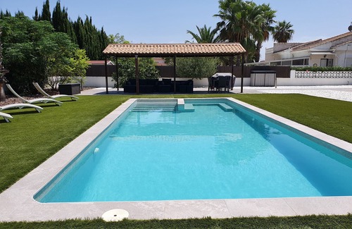 The accommodation is equipped with the following items: garden, garden furniture, fenced garden, 100 m² terrace, washing machine, dryer, barbecue, iron, internet (Wi-Fi), hair dryer, balcony, heat pump, air conditioning throughout the house, private swimming pool, open-air parking the same building, 5 TVs, tv satellite (Languages: Spanish).