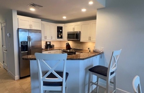 The décor reflects a high degree of sophistication and design. Throughout the suite you will find travertine marble floors and tiles. There is a fully equipped kitchen with granite countertops, breakfast bar and stainless steel appliances, separate dining and living areas, washer and dryer (iron and ironing board), wheelie grocery cart, cooler and a beautiful and spacious patio/balcony overlooking the ocean furnished with table and chairs for morning coffee or afternoon cocktails.