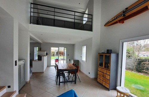 Peaceful area, large modern house on Saint Brevin L'Océan, very well equipped (dishwasher, washing machine, dryer). It will offer you all the necessary comfort for a great holiday. The large living room with its open kitchen, equipped with a back kitchen/laundry room, opens onto a beautiful covered barbecue terrace and garden furniture as well as a large reception room. On the ground floor you have a master bedroom and a bathroom. This house also has a floor consisting of an office space as well as a mezzanine with a 2-seater sofa bed, open to the living room, a second bathroom and two bedrooms with 140 cm beds. . This property also has a beautiful garden. WIRELESS Pets not allowed. Optional service to be paid on site: household linen (sheets, pillowcases, tea towels, bath towels) and end of stay cleaning. Unless stated, services such as cleaning, bed linen, towels etc. are not included in the price of this rental. If pets are allowed (information in the advertisement), charges may be applicable. Only equipment mentioned in this advertisement are present. Equipment not mentioned are not considered to be present.