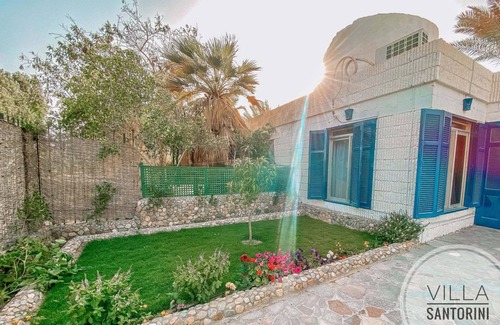 Villa Santorini located in Touristic center, Elmamsha. Have private beach (7-10 min walking), private garden with perimeter fence, parking. Near shops, markets, cafes. From airoport 10 min. From citycenter 10 min