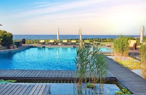 The property is completed by a 136-square-metre swimming pool with seawater and equipped with natural sea-salt sterilisation treatment, waterfall, jet for counter-current swimming, and hydromassage corner; a solarium area with teak deck and a wellness area with Finnish sauna.