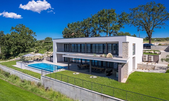 Location and Views: Situated within a vineyard, the villa offers breathtaking sea views from various parts of the property. The fact that each bedroom, terrace, and the swimming pool provides these views adds to its allure. The clear weather visibility of the Italian Alps and the Učka mountain from the property is an added bonus.