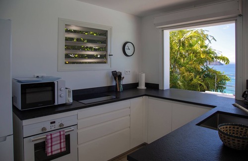 With a spectacular view over the ocean and the surrounding islands, vacation villa TORTUE welcomes you in a modern and elegant design. The living room and dining room are located under the covered terrace gently swept by trade winds. In an open space ideal for relaxing and resting, there are armchairs with soft footrests facing the view near the dining table which can accommodate four guests. The kitchen opens onto this covered terrace, and is well-equipped with all appliances for the preparation of meals and drinks.