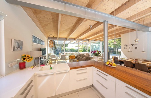 Open-plan kitchen with dining area for six people