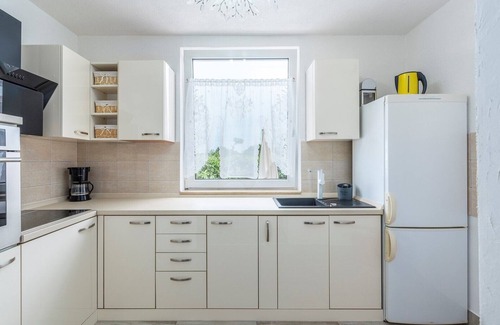 This luxurious apartment is on the ground floor and consists of a bedroom with double bed, a bedroom with 2 single beds, a kitchen with a dining room, a living room with sofa bed and a bathroom with a bathtub. The kitchen is fully equipped. The apartment has free Wi-Fi, air conditioning, satellite TV, bed linen and towels. It has a terrace with a large fenced garden with pool, sun loungers, sun umbrellas, outdoor shower and a barbecue. Private parking is also available. Pets are welcome!