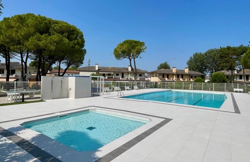 Comfortable two-storey townhouse house featuring a balcony and a private garden, located in a residence with shared outdoor pools. It can accommodate up to six guests. The property is composed of an open plan kitchen, a dining/living room with a trundle bed, a bedroom with two single beds, a double bedroom, and a full bathroom with a shower box. Equipped with one uncovered parking space, and a washing machine. Beach distance: 440mt. A/C is available at an additional cost (check below).°Swimming pools are open seasonally (mid June/early September): exact dates may vary due to weather or maintenance. Tennis court available for a fee > 5 euros per hour.