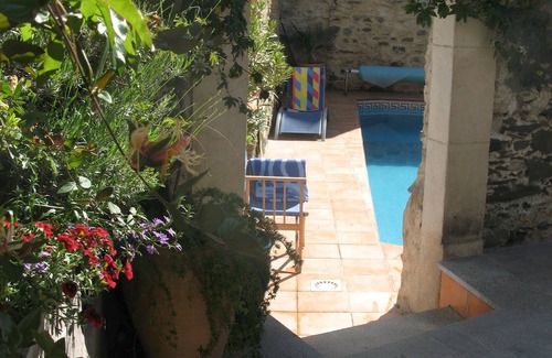 Centrally yet privately located in a small, friendly village 25 min NW of Béziers, the three storey house comfortably accommodates six people. The ground floor is open plan with a well equipped kitchen, dining area and sitting area, and there are three bedrooms, two bathrooms and a further bed/sitting room. The sunny, elevated terrace with garden furniture and attractive outlook adjoins a walled 9x4m pool with sitting area and loungers. Bar, restaurant and bread dispenser are within easy walking distance, all other services are within 10-15 min by car, four airports within 45-90 min, river beaches 10 min by car and Mediterranean beaches/Aquapark/golf 45 min. The area is superb for walking, winetasting, canoeing and river swimming (River Orb and Roquebrun) and offers plenty of interest for lovers of wildlife, landscapes and history. Our changeover day is Saturday. Our house is a no-smoking zone, and we do not accept pets.