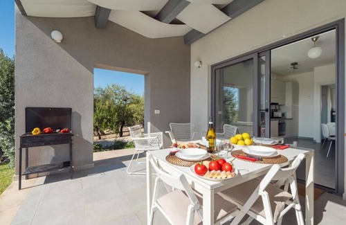 The villa (80 sq.m) develops over one level, with beautiful sea views in the distance, each room having its own direct access to the outside area.