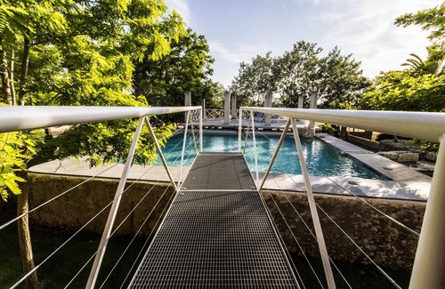 A staircase between the bedroom and living area leads to the upper floor. There are two further bedrooms and two bathrooms, one of them in a suite. The master bedroom here on the first floor is very spacious, the view from here is fantastic over the property and the rural surroundings. Also from the fourth double room above you have a wonderful view. From the upper floor, a modern footbridge led to the elevated pool. For early risers who like to take a swim in the pool after getting up, this is an incomparable sensation.