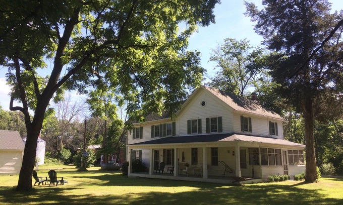 Situated on a private, protected Land & Water Reserve, this charming 19th-century farmhouse offers spacious, retreat-style living, inside and out. Family owned and operated, Fox River Country House is ideal for birdwatchers and nature lovers and is just minutes from local attractions (historic Ottawa, Skydive Chicago, village of Norway, Dayton Bluffs, Starved Rock State Park). Secluded property features twenty-plus acres of woods and riverfront, all available to guests via winding pathways. Beautifully maintained two-story house with one king bedroom (attached bath), double room with one full and one twin bed, and two cozy twin rooms. Enjoy stunning views on screened south-facing porch. Open front porch overlooks large, shaded yard with fire pit (free firewood). Huge additional side yard with ample space for outdoor games. Whether you're looking for a peaceful getaway or a fun-filled adventure, Fox River Country House is perfect for any type of traveler.