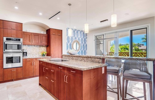 The expansive covered lanai rounds out this exceptional residence. This outdoor entertaining option features comfortable lounge seating and a Viking barbeque gas grill. Whether you want to sip your morning coffee and enjoy the views or dine alfresco while grilling, you’re sure to feel right at home. Take advantage of the close proximity to the family pool, fitness center and quick walking distance to Wailea Beach.