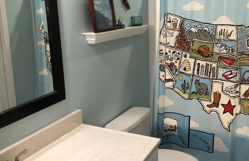 Three bedrooms and two an a half bathrooms, this two story house has plenty of room for families. The master bedroom has a king size bed with en suite bathroom. The second guest room has a queen size bed. The third guest room has a twin bed with an extra twin should it be needed. The two guest rooms share a full size bathroom with a tub/shower combo.