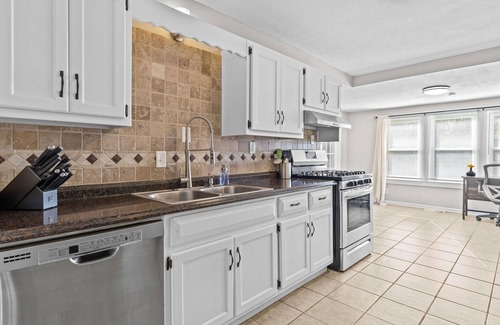 The kitchen is a guest favorite, fully equipped with brand new stainless steel appliances and all the essentials for home-cooked meals. Coffee lovers will be thrilled with the dedicated coffee bar, featuring four brewing options: drip, Keurig, French press, and pour-over. A selection of k-cups, creamer, and sugar is provided with every stay. The kitchen is also stocked with cookware, utensils, dishes, and glassware for your convenience.