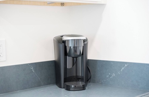 The cozy living room boasts a large smart TV, board games, and a dining table for four guests. It opens into a spacious kitchen equipped with a 36-inch gas range, Keurig coffee machine, air fryer, and toaster—everything you need to prepare meals with ease.