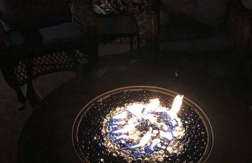Our private back yard has a gas fire pit . Sit outside at the Outdoor dinning table.Outdoor pool has water feature, and solar blanket during the winter months . It’s only heated by sunshine!